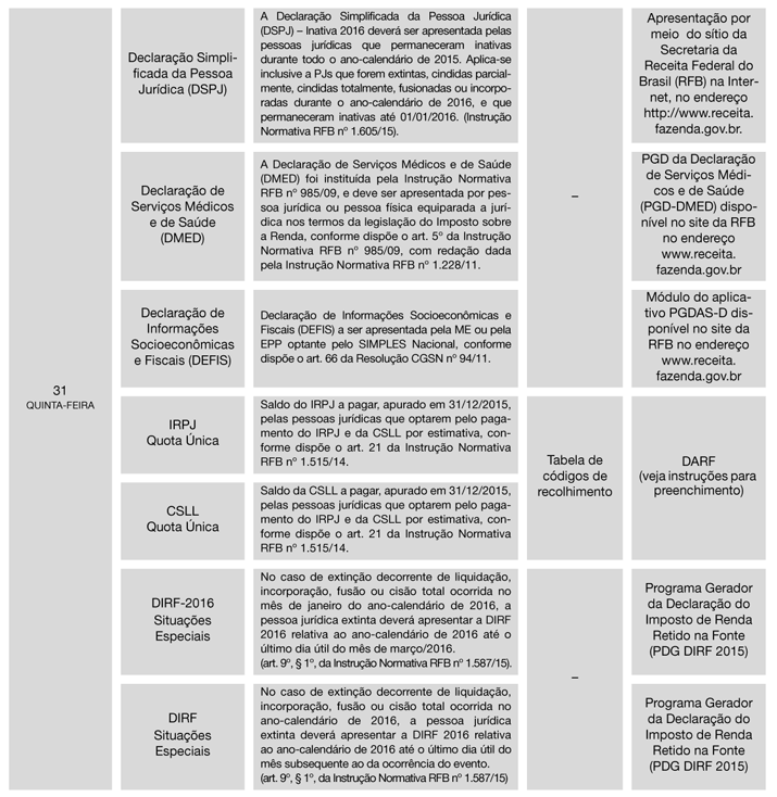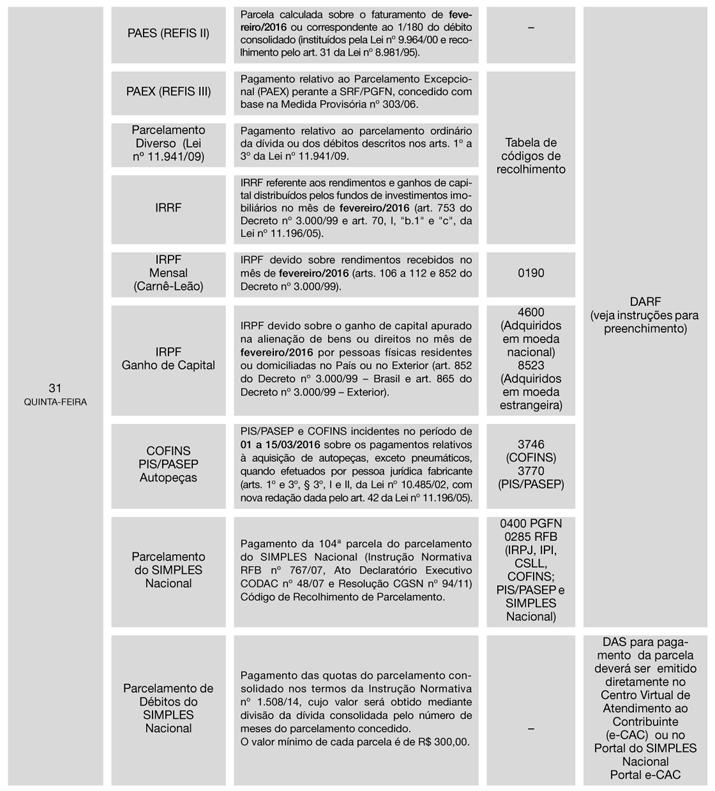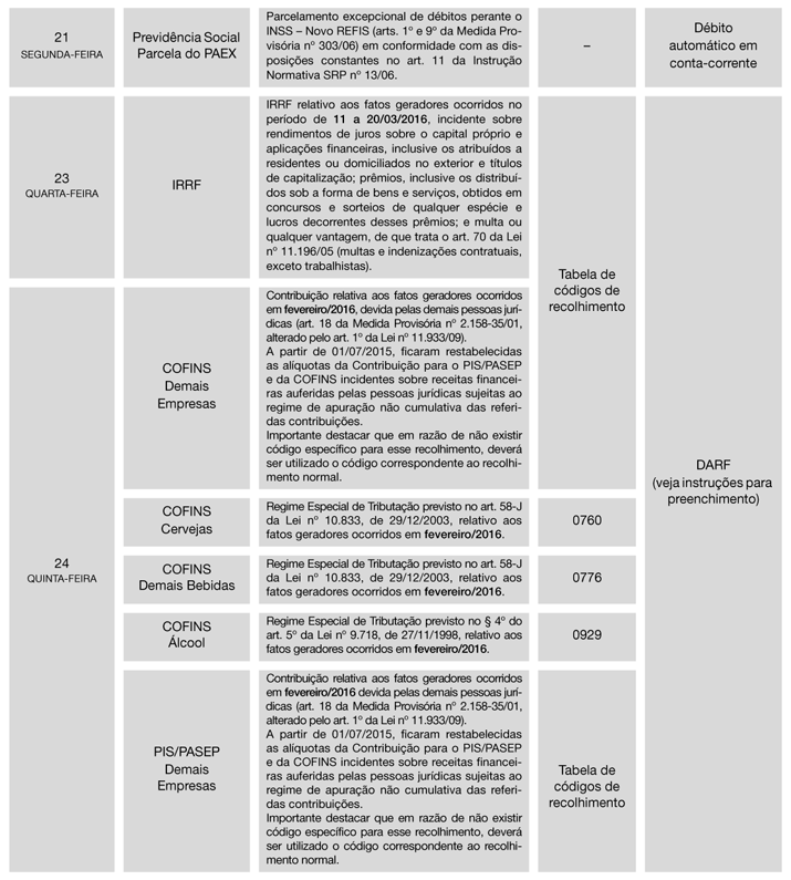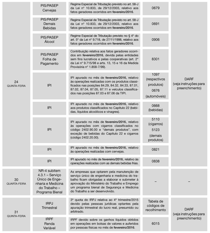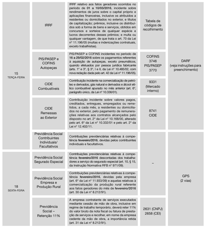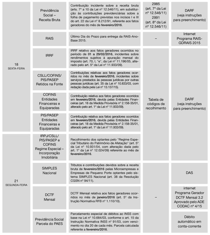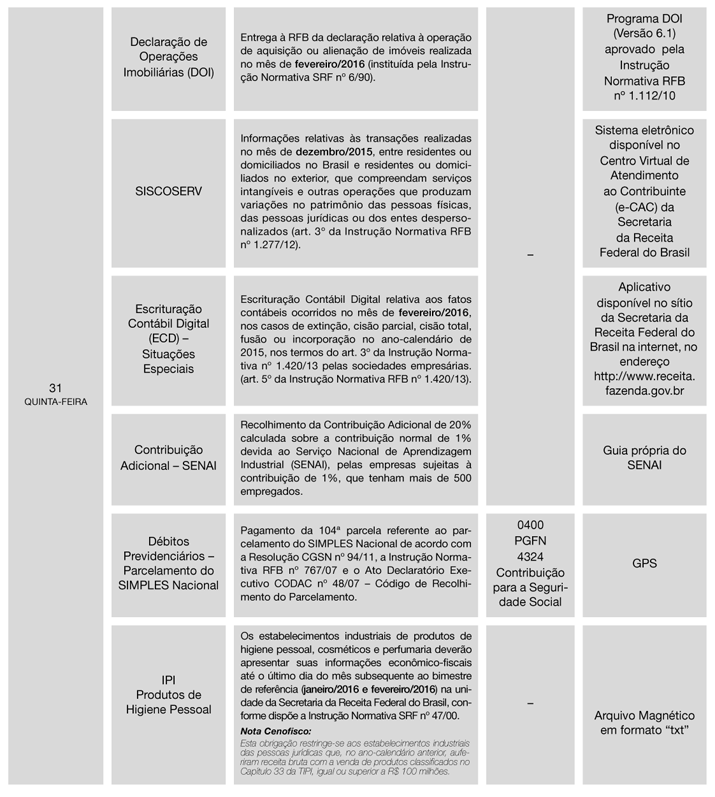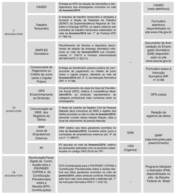 1ª) Tendo em vista que o Calendário foi elaborado com base na legislação vigente em 10/02/2016, o assinante deverá manter-se alerta quanto a eventuais alterações posteriores, que serão informadas no Cenofisco BD On-line.